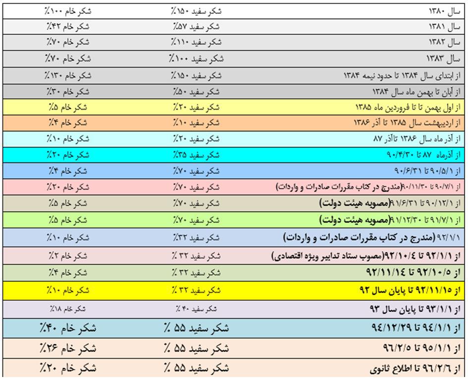 در حالی که در دوسال گذشته تعرفه واردات شکر سفید 55 درصد باقی مانده است، تعرفه شکر خام از 40 به 26 کاهش یافته بود. در جدول زیر تعرفه واردات شکر سفید و شکر خام  از سال 80 قابل مشاهده است.