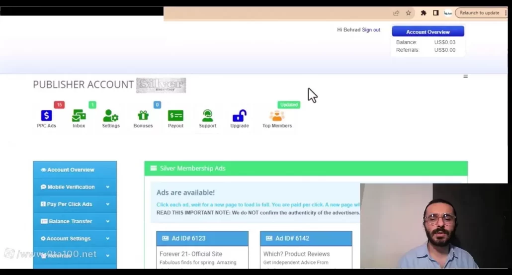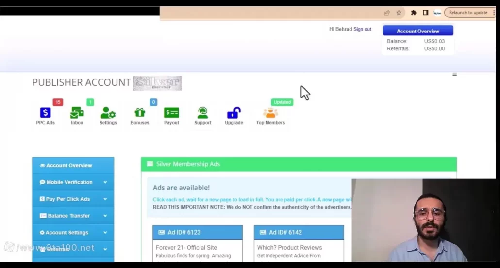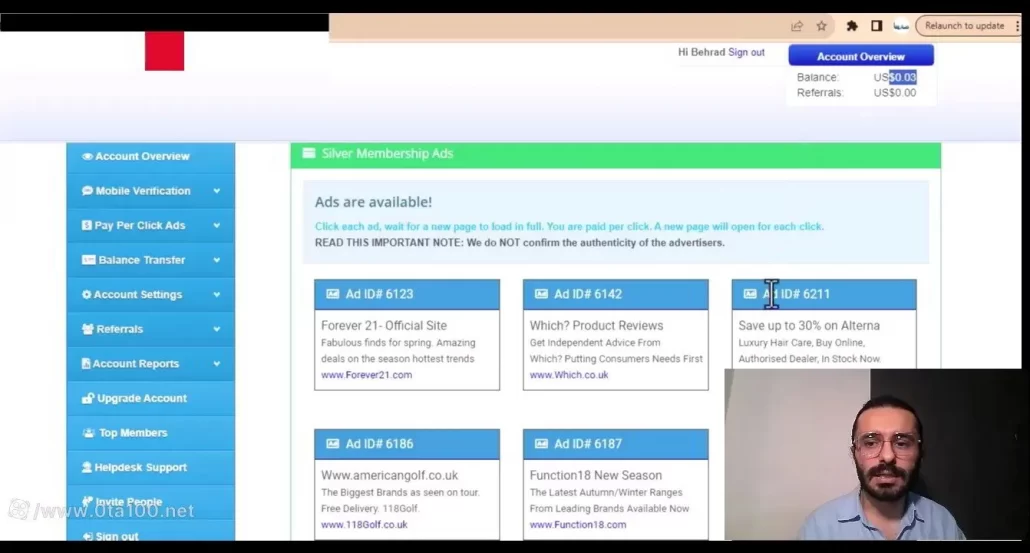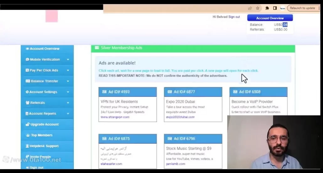 سه تا یک سنت، به من سه سنت تا الان پول داده است. روی یکی از این تبلیغات که کلیک کنم فقط کافی است چند ثانیه صبر کنم تا تبلیغ لود شود. به همین راحتی الان پول به اکانت من اضافه شده است.
