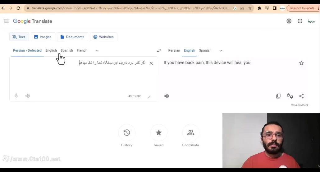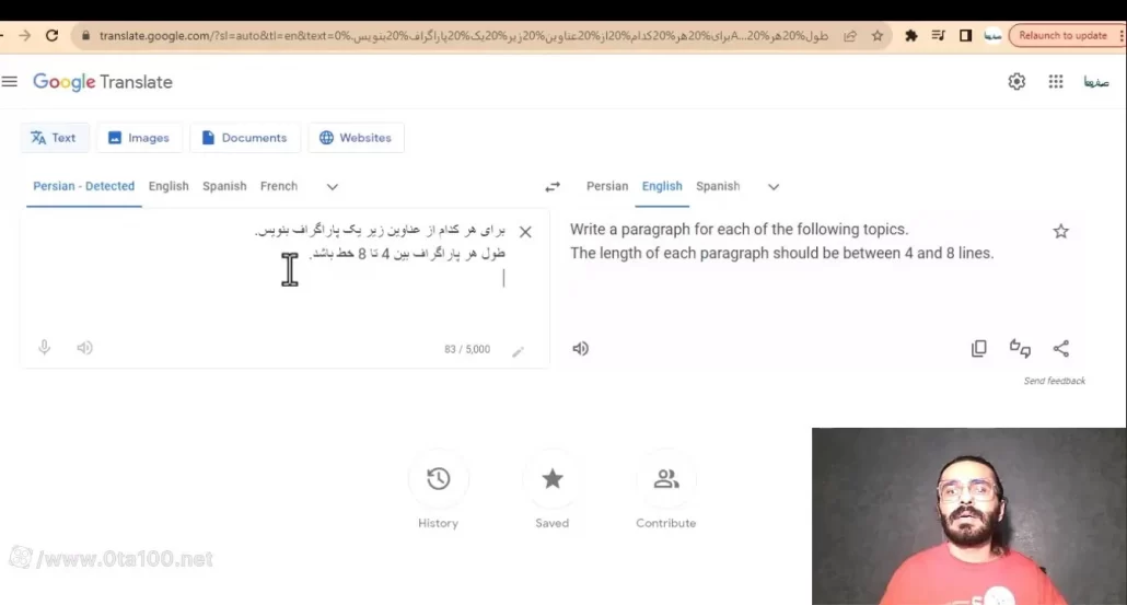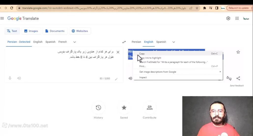 بعد به گوگل ترنسلیت میروم و فرض میکنم انگلیسی نمیدانم و به فارسی مینویسم: «برای هر یک از عناوین زیر یک پاراگراف بنویس و طول هر پاراگراف بین ۴ تا ۸ خط باشد.» این دستوری است که داریم آماده میکنیم تا به ChatGPT بدهیم تا بر اساس این دستور و عناوینی که داشتیم یک مقاله خوب و تمیز تحویلمان دهد.