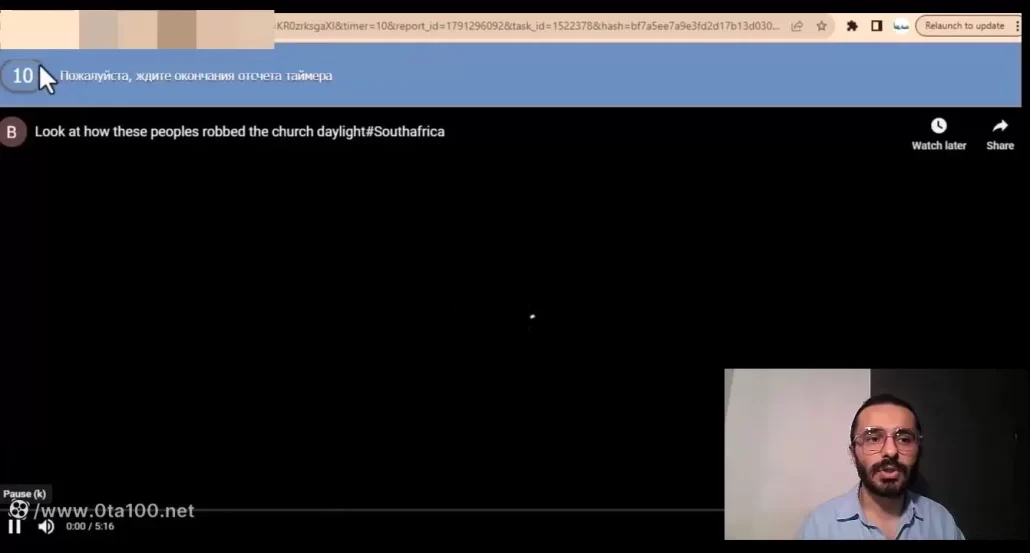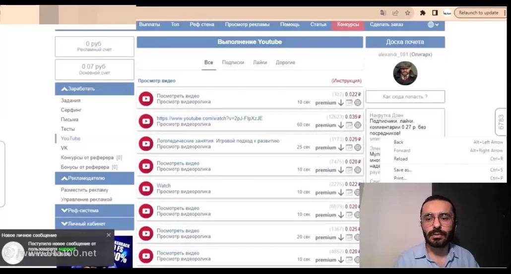 حالا زبان وبسایت به انگلیسی تغییر کرد. اینجا میبینید که میکروتسکهای زیادی را می توان انجام داد. یکی از آنها مشاهده ویدیوهای یوتیوب است. اینجا هر یک از ویدیوها را که باز کنید به شما پول میپردازد. به روبل پول میدهد. مثلا من این ویدیو را باز میکنم. این را میزنم تا پلی شود. با ترفندی که بعدا به شما آموزش میدهم همزمان میتوان چند تا را پلی کرد.
