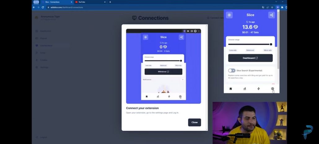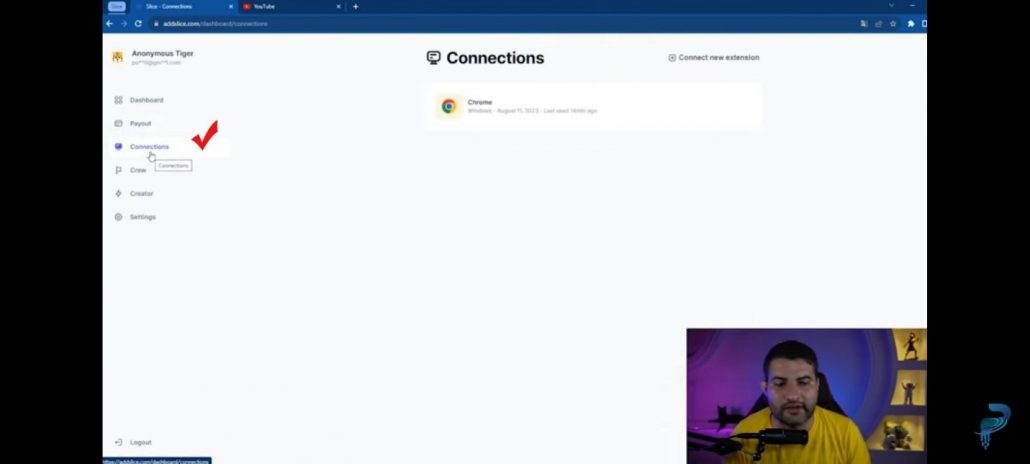 برای شروع برید داخل گزینه connection و مرورگر کرومتون رو کانکت کنین به نرم افزار و افزونه اسلایس. ما طبق عکسی که میبینید، از قبل کانکت رو انجام دادیم، فقط کافیه که شما گزینه connect your extention رو بزنین و طبق مراحلی که داره بهتون نشون میده باز روی اون اکستنشن کلیک کنین.