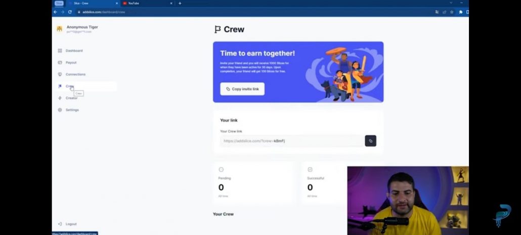 قسمت بعدی CREW هست (رفرالگیری هست) که شما میتونید از این قسمت هم درامدزایی داشته باشین؛ فقط کافیه کد رفرالتون رو که داخل عکس میبینید رو کپی کنید و با دوستاتون یا شبکه های اجتماعی مشهور به اشتراک بذارین تا دامدزایی به شدت عالی رو داشته باشین که در قسمتهای بعد بهش اشاره میکنم.