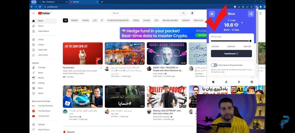 مثلا مطابق عکسی که میبینید، میریم داخل یوتیوب، یه تبلیغ وجود داره، روش کلیک میکنیم. چند ثانیه داخل تبلیغ وایمیسم و بعدش اکستنشن خودمو نگاه میکنم. میبینین این مقدار برامون اضافه میشه و هی برام اسلایس جمع میکنه.