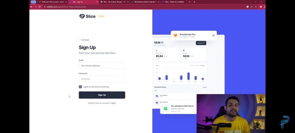 اگرم برا اولین باره که میخواین از اسلایس استفاده کنید، باید برید توی سایت اسلایس و یه اکانت بسازید. توی گزینه sign up ایمیل و پسورد رو انتخاب کنید و بذارید. حتما پسوردتون باید یه حروف انگلیسی کوچک و یه حروف انگلیسی بزرگ و یه علامت مثلا علامت دلار یا علامت تعجب داشته باشه و بعدش تیک رو میزنید و آخرشم گزینه sign up بزنید تا ثبت نام براتون کامل شه.