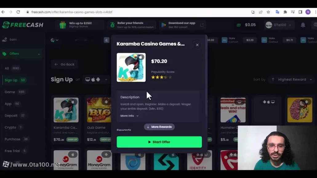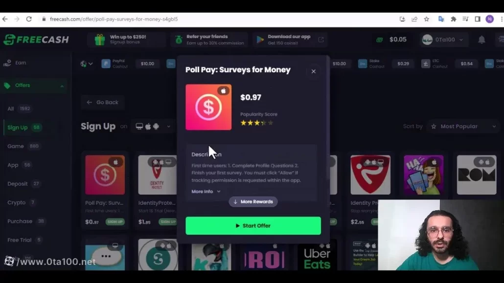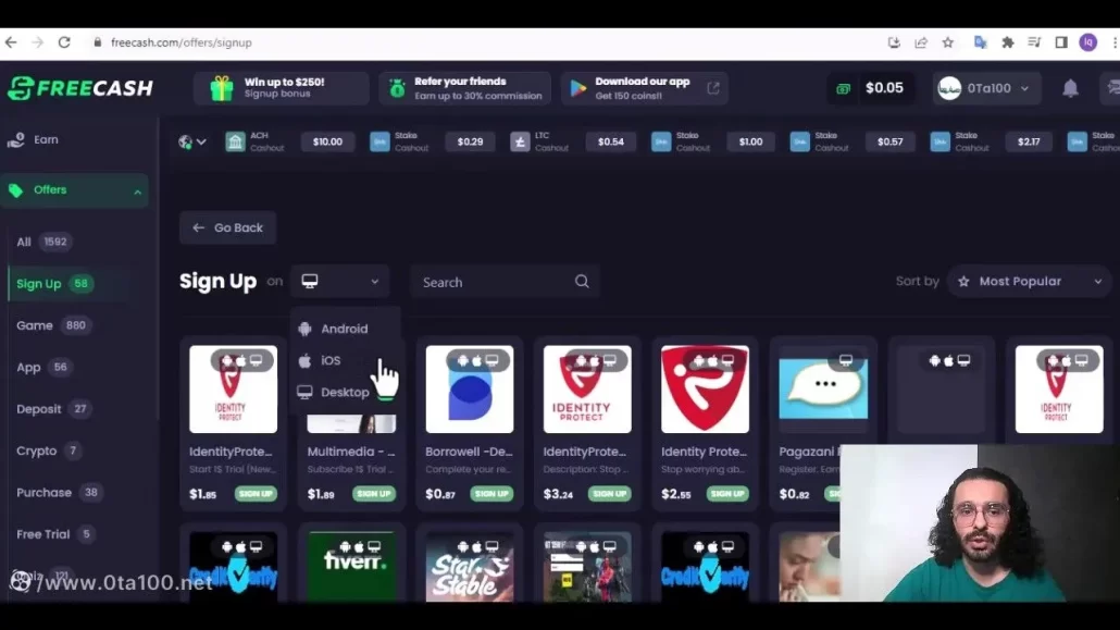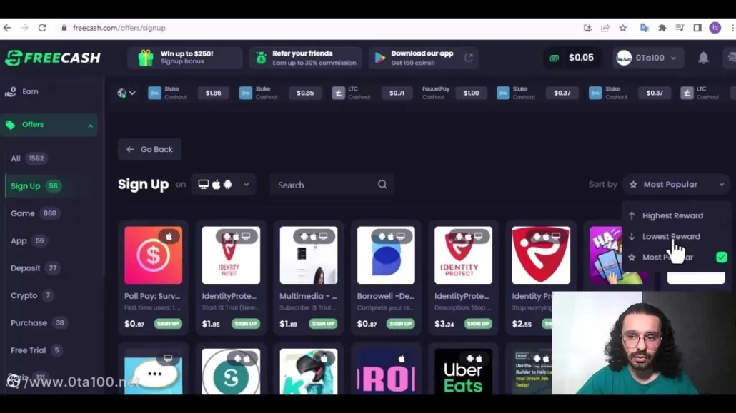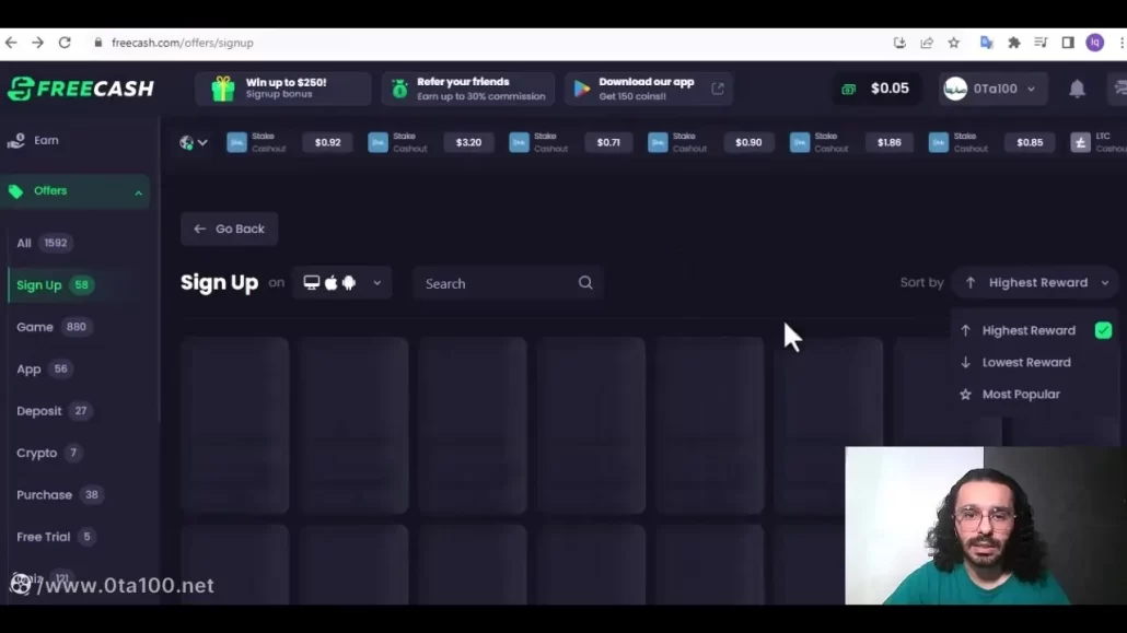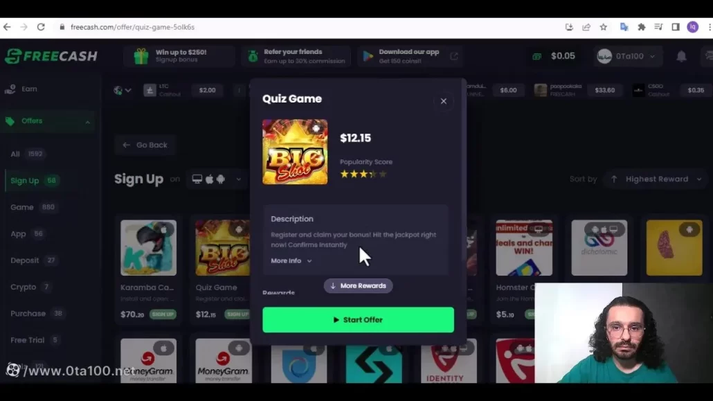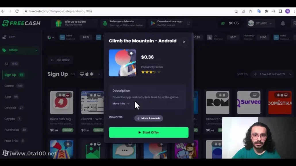 مثلا sign up را انتخاب کنید. Sign up یعنی میکروتسکهایی که مربوط به ثبت نام هستند. شما در وبسایت یا اپلیکیشنی ثبت نام میکنید و بابتش به شما پول میپردازند. Game بازی هست، و بازی میکنید. اپلیکیشن اپ دانلود میکنید. یا کوییز پرسشنامه را تکمیل میکنید. یعنی به پرسشهایی جواب میدهید و بعد از تکمیل پولتان را دریافت میکنید. (در صورت ابهام در زمینه آموزش سایت free cash، میتوانید با مشاوران وب سایت صفر تا صد در تماس باشید.)